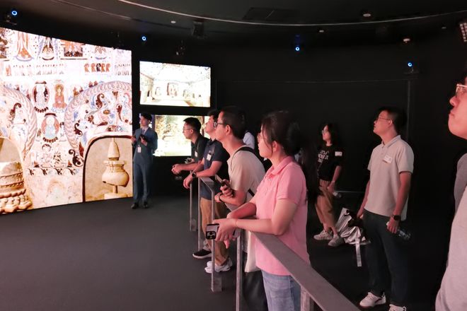 在数字文化展区,敦煌莫高窟285号洞窟通过游戏引擎1:1重现,震撼全场。讲解员手持虚拟电筒照亮壁画,全动态光学技术让壁画上人的衣褶纤毫毕现;动作捕捉系统实时映射人体姿态,可以在虚拟洞窟中自由探索。