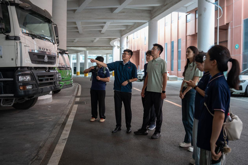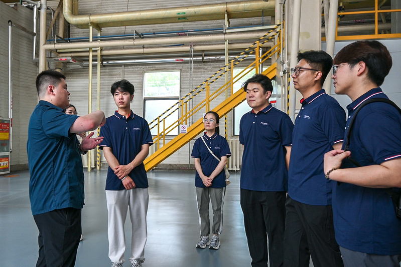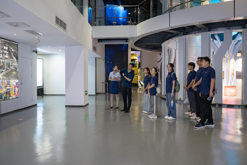 离开博物馆,实践队深入探访了整车试验室与发动机排放试验室。在工作人员的现场演示下,队员们见识了高压、低温等极端环境下的模拟测试技术,以及如何通过数据分析优化实现环保要求与性能表现的精准平衡。在卡车展示区,形式多样的新能源重型卡车让队员们大开眼界。讲解中得知,近年来中国重汽积极布局新能源领域,探索以三元锂电池与氢燃料电池替代传统柴油机,大力推动绿色低碳转型,以实际行动落实国家“双碳”战略。在讲解过程中,队员们也结合自身专业知识,与技术人员展开了热烈交流,队员李秉罡表示:“在尾气污染物吸附与检测的技术讲解中,我直观感受到了所学知识是如何落地应用的,为我今后的科研工作也产生了极大的启发。”