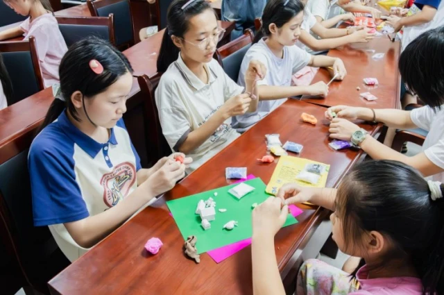 理论讲解后,课程进入创意实践环节。刘子乾分发提前打印好的小房子框架、小桥、星星、蘑菇等“魔法基石”,搭配超轻粘土和画笔,鼓励孩子们搭建专属“魔法村庄”。孩子们兴奋地为粘土角色设计故事场景,天马行空的想象在卡纸方寸间蓬勃生长。最终,所有作品汇聚成一片壮观的“魔法世界”,孩子们自豪地为自己的杰作命名,分享创作背后的奇思妙想,并荣获象征荣誉的“魔法造物师”奖励。指尖流淌的不仅是粘土,更是被科技之光点亮的自信与梦想。
