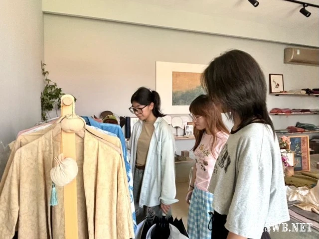 朱春莲创办的“无失山房”工作室,陈列着茶染围巾、杯垫、扇子等作品,浅绿如春芽,深褐似陈茶,每一寸纹理都是茶叶与棉麻丝的自然对话。“植物染色变化万千,每次都是惊喜。”她轻抚布帛解释。茶染需经采摘老叶、熬汁、低温煮染、晾晒等多道工序,尤以本地绿茶为佳——汤色黄绿明亮,染出的布料自带清透茶香264。