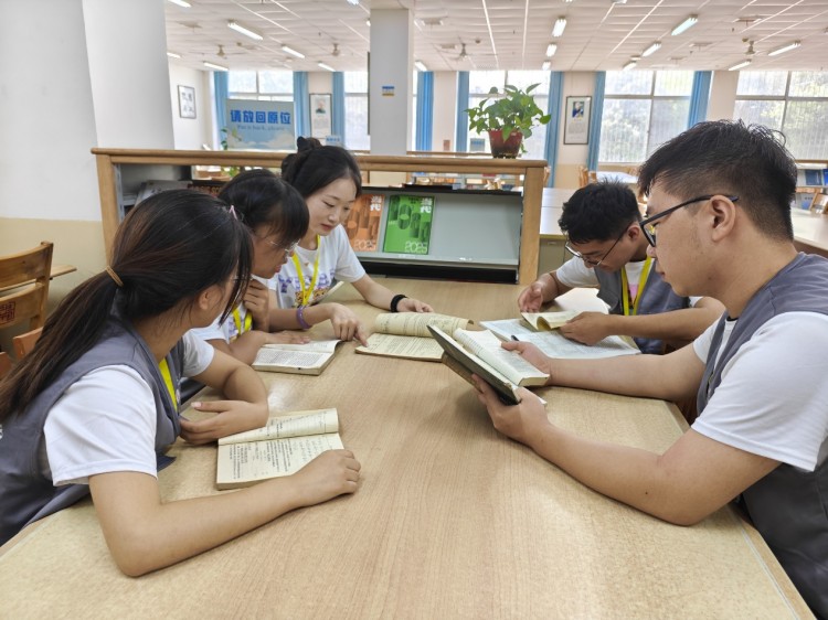 图为实践团成员翻阅当时典籍,一起相互讨论|陈坤供图