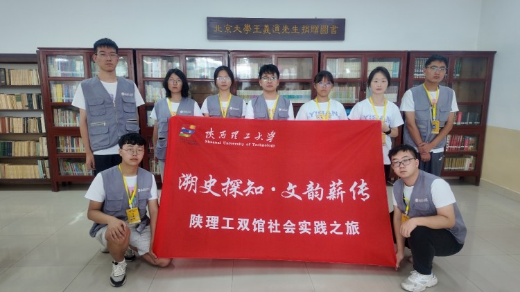 图为实践团成员在北京大学王义遒先生为陕西理工大学赠送书籍处的合影|黄嘉铭供图