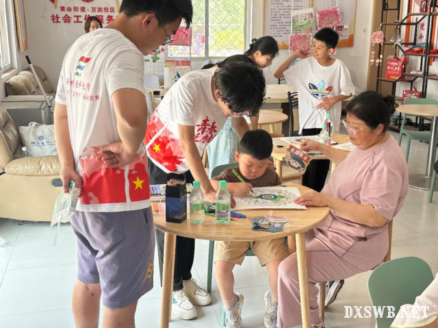 在绘画创作环节中,孩子们全神贯注地挥洒创意,画笔在纸上翩跹起舞。实践团成员们则化身"护梦使者",细致观察每个孩子的创作过程。对于专注力较弱的特殊儿童,实践团成员轻握他们的小手协助完成画作。小朋友们在家长的陪伴下,用天马行空的想象力勾勒出绚丽多彩的童真世界,一幅幅作品仿佛绽放着朵朵色彩之花,诉说着独特的心灵故事。