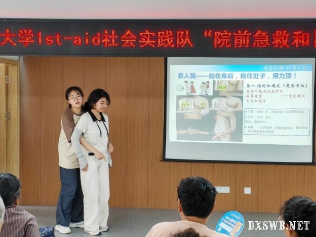 针对老年人容易发生的呛噎风险,实践队进行了海姆立克急救法的重点讲解和现场演示。两名队员配合默契,一人模拟被异物卡喉,另一人则标准示范施救动作:“站身后→抱肚子(肚脐上方两指)→用力快速向上向内顶!”清晰的动作分解和“剪刀、石头、布”的定位口诀让居民们印象深刻。宣讲还特别强调了预防呛噎的重要性,给出了“小口吃、专心吃、慢慢嚼、坐直吃、喝水送、小心吃、吃药慢”等七条实用进食安全贴士。对于自救、救助轮椅或卧床患者等不同场景下的操作要点,也进行了详细说明。