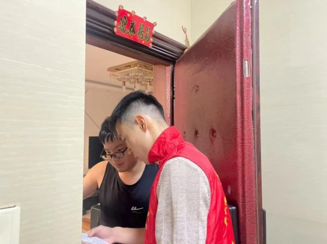 图为实践队成员在社区工作人员的指导下了解居民信息。
