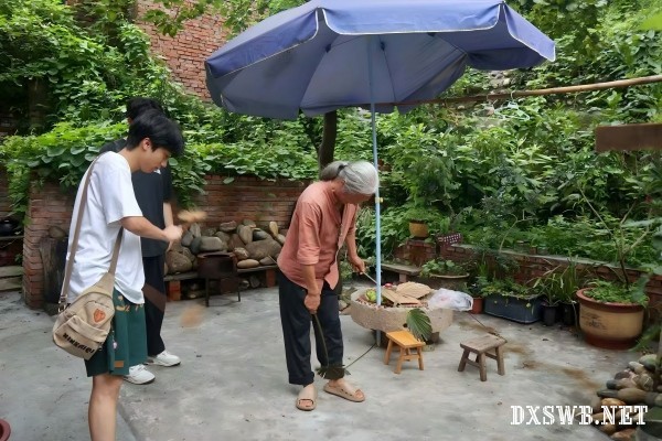 实践首日,团队赴鑫田粮艺试验田与绵州汇馆进行实地考察。盛夏的试验田绿意盎然,却也蚊虫滋生。传承人潘德贵老师贴心为大家准备了传统驱蚊工具“掸掸”,并笑着说道:“这‘掸掸’可是我们老农人的‘宝贝’,别看它简单,一草一叶都是自然的馈赠。”在潘老师的带领下,队员们深入田间,认真观察作物生长状况,了解传统农业技艺的现代应用。亲手使用“掸掸”的体验,不仅让大家感受到传统农具的实用智慧,更体会到农耕文明中人与自然和谐共生的理念。