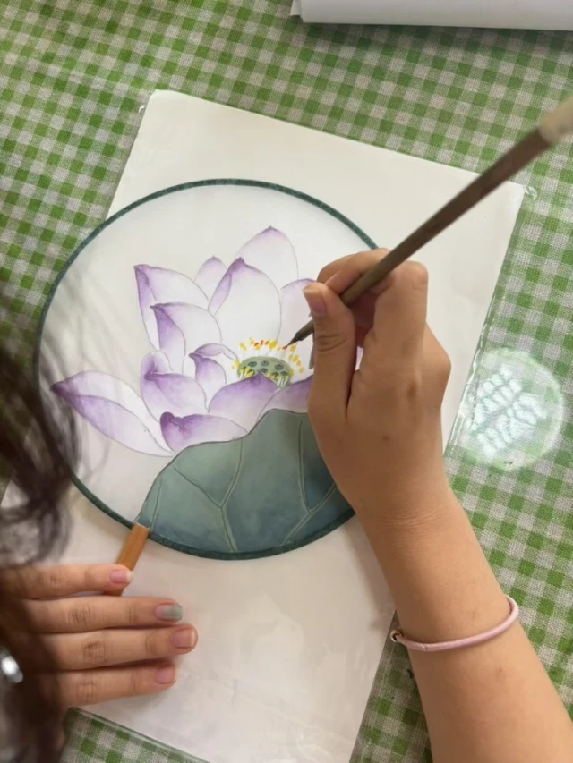 活动现场墨香四溢,孩子们专注地挥毫泼墨,原本素白的团扇上渐渐绽放出朵朵清荷。10岁的张梓涵展示着自己的作品:"我以前只在博物馆里见过这么漂亮的团扇,没想到今天自己能画出来。我要把这把扇子送给奶奶,她最喜欢荷花了。"