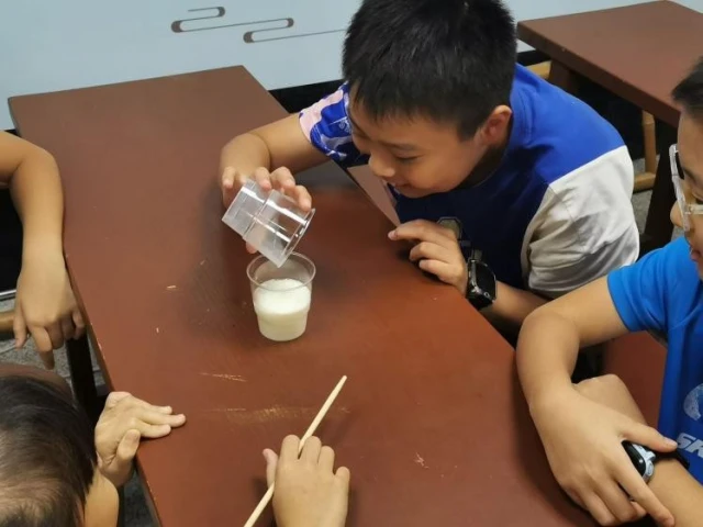 在知识讲解环节后,活动进入互动实践与案例分析阶段。志愿者展示了某饮品的营养成分表,引导孩子们关注能量、蛋白质、脂肪、碳水化合物(尤其是糖)的含量,通过“隐糖现形记”环节,让孩子们认识到部分饮品中“隐形糖”的存在,理解选择健康饮品的重要性。随后的“牛奶的秘密”实验环节更是将气氛推向高潮,志愿者指导小朋友们将白醋缓慢倒入牛奶中,观察牛奶中蛋白质在特定条件下沉淀的现象,直观感受蛋白质的特性。实验结束后,志愿者还围绕“怎么判断牛奶是不是坏了”“多喝牛奶就是喝得越多越好吗”“吃水果Vs榨成汁”等贴近生活的问题与孩子们展开讨论,进一步加深他们对营养知识的理解与运用。