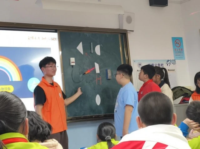 活动伊始,团队先强调激光笔使用安全,随后以“生活中的光影现象”为切入点抛出谜题。课堂核心环节聚焦三大光学原理,层层递进开展教学:通过“激光笔照射果冻”的直观实验,学生清晰观察到光的直线传播轨迹,结合生活实例,快速掌握“光沿直线传播”的知识;5名学生分组上台操作镜面,在调整角度、观察光束“拐弯”的过程中,亲手探索光的反射与漫反射规律,理解穿衣镜、汽车后视镜的应用逻辑;当白色光束穿过三棱镜折射出红、橙、黄、绿、蓝、靛、紫七彩光带时,学生们纷纷举手抢答颜色名称,在惊叹中知晓了雨后彩虹、彩色泡泡花纹背后的色散原理。