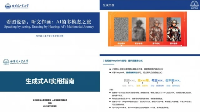课程伊始,哈工大人工智能宣讲团的刘铎以《看图说话,听文作画:AI的多模态之旅》为主题开启授课。他摒弃晦涩的专业术语,用通俗易懂的语言为同学们阐释了“AI模态”的核心概念,系统讲解了多模态人工智能大模型的基本工作原理,让同学们快速建立起对多模态AI的基础认知。