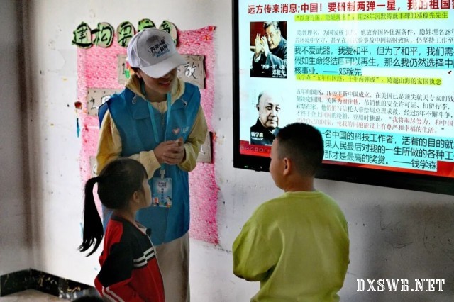 在宣讲过程中,志愿队成员注重普通话的规范使用,巧妙地将语言学习与爱国主义教育相结合,通过标准发音、清晰表达,引导孩子们在聆听中学习、在互动中模仿,将语言学习与精神教育自然融合。过这种教学方式,孩子们既学习了标准发音,又在潜移默化中加深了对科学精神和爱国情怀的理解。