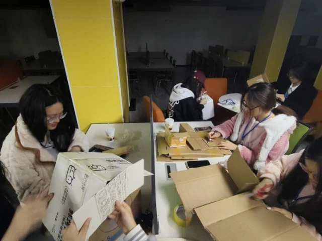 活动开始,周琅瑶和何亚璇阐述了本次活动的双重宗旨:一是推广资源循环利用的环保理念,二是通过亲手劳作培育对生命的尊重与关爱。在完成安全注意事项说明后,各小组迅速投入创作实践。活动现场秩序井然,氛围认真而专注。志愿者们分工明确,协作有序。部分同学专注于小屋的结构设计与加固,通过精确裁切、拼合硬纸板,确保作品稳固防风;同学巧妙利用旧布料、棉絮等材料进行内衬铺装,切实提升庇护屋的保暖性能与舒适度。原本将被丢弃的废旧纸箱,在同学们的匠心巧思与细致劳作下,逐步转变为既实用又具美感的“生命驿站”。