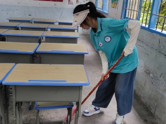 图为志愿者为 在进行把教室打扫干净,让学生们有一个干干净净的教室,安安心心的来上课。 大学生网报通讯员 郑梅芳 摄