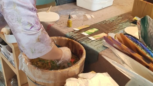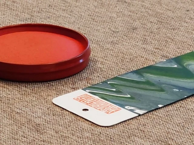 “描扇微舞唐风雅,金指拨云绘绮霞。”漆扇,独具传统东方美学。在“饺子”老师的指导演示下,团队成员观摩学习并沉浸式体验了传统的漆扇技艺。大家自由搭配喜欢的颜色,按照老师的指导向水中滴入大漆,再通过吹动使颜色流动组合,用不同的方式入水,接着盖章、系绳进行装饰,得到属于自己独一无二的漆扇或书签。通过沉浸式体验,团队成员更加深入地了解了漆扇这项传统工艺,体会到了东方独特美学。