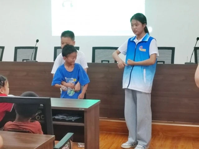 接着,实践队员们讲解了防溺水急救技能并进行了现场模拟。孩子们积极参与,亲身体验了如何使用海姆利克急救与心脏复苏急救方法,实现知行合一,充分掌握。