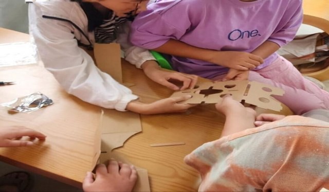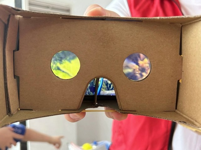 图为小朋友们组装VR眼镜成品 (志愿者 庄欣纯摄)