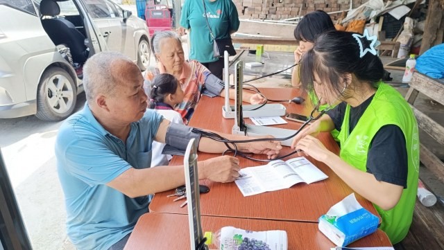 图为践行团成员们在为村民进行免费血压测量。大学生网报通讯员 弄春梅 供图