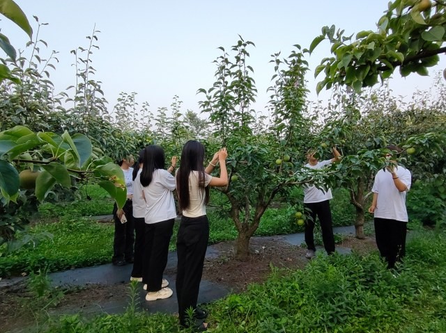 7 月 13 日上午十点,农学与生物科技学院“知行合一”实践团队准时抵达大名县岳庄村,开启了对梨树病虫害的观测工作。他们专注地查看每一棵梨树,重点关注了裂果、梨锈病等常见病虫害。只见他们手持笔记本,详细记录下病虫害的症状表现,如裂果的形状、大小和分布,梨锈病在叶片上的病斑特征等。为了获取更全面的信息,同学们还不时地相互交流探讨,与当地果农请教经验,展现出了严谨的治学态度和对知识的渴望。