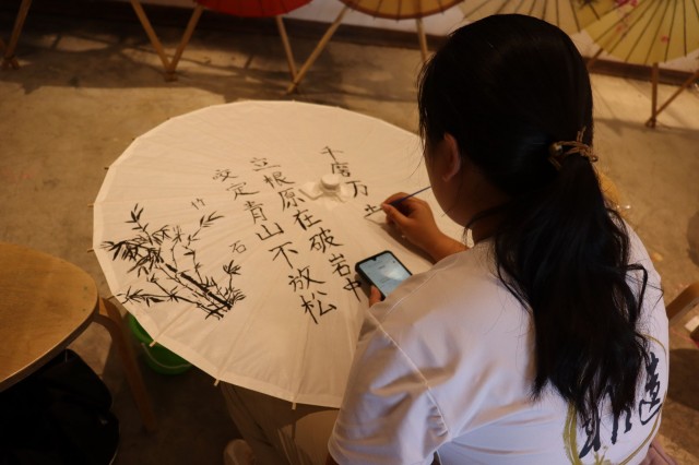 油纸伞,世界上最早的雨伞,纯手工制成,全部取材于天然,是中国古人智慧的结晶。 由于时间有限,制作油纸伞的工艺复杂,我们最后体验了油纸伞的绘图,队员们亲手为自己的油纸伞绘制图案,制作一把属于自己的油纸伞,在绘制的过程中,让我们感受到了伞中的诗意与浪漫,每一把伞下都藏着一段故事。