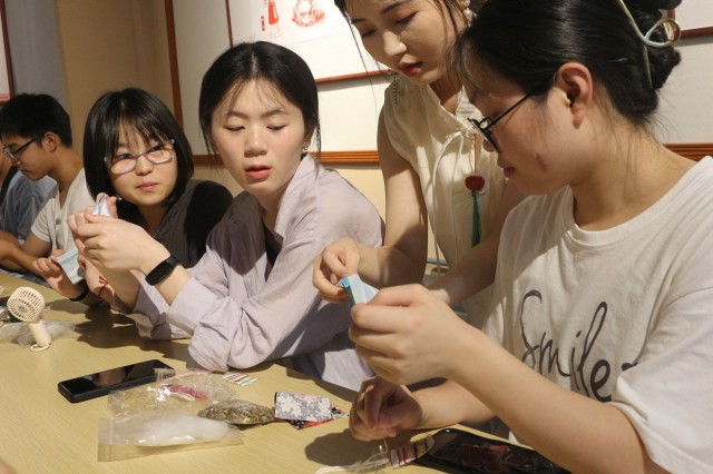 保护是最好的传承,传承是最好的保护。参观完展览馆,团队便开始第二个项目,制作手工非遗香囊。在老师的介绍下,我们了解到香囊的历史悠久,种类多样,寓意丰富。古人常佩戴香囊来防病健身,也会相互赠送表达爱意。