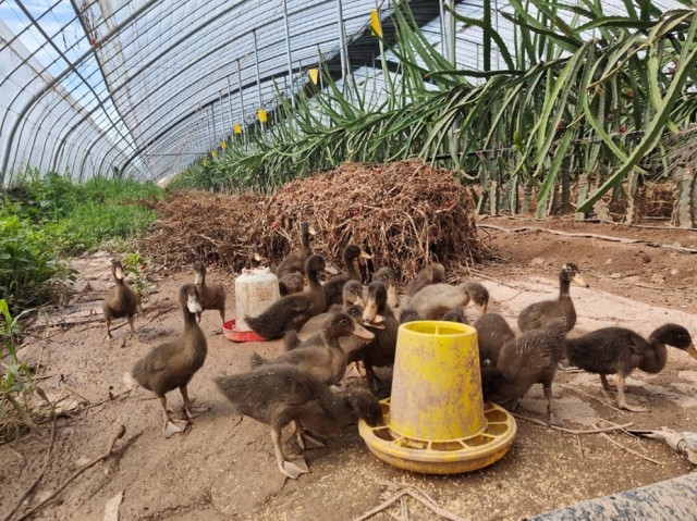 7月20日当天,绿野遗芳实践团队来到火龙果种植基地,通过与基地负责人的沟通交流,团队成员了解到,该基地是泾阳县第一家大胆引进新品种并成功种植火龙果的种植园,采取养殖一体化的模式,大棚内上半部分种植火龙果,下半部分则是用于养鸭子和鹅。负责人讲解说:“鸭子是用来处理蚂蚁,鸭子吃蚂蚁,就能防止蚂蚁去咬火龙果的根。然后菜上的烂果和一些烂菜叶,鹅也会去吃。”养殖一体化的新模式,不仅是空间合理利用的体现,更是村民为经济发展开创的新思路。
