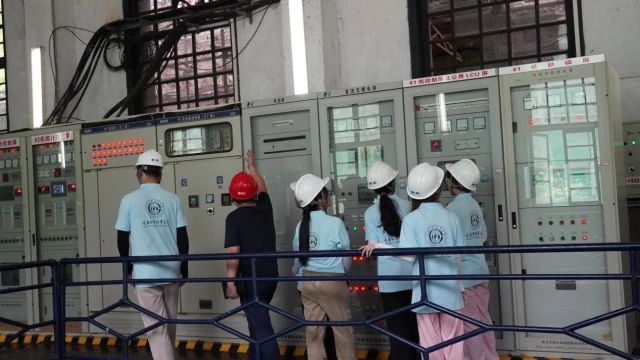 参观完陈列馆后,成员们又相继来到电厂发电现场进行学习。厂房内闷热嘈杂,汗水瞬间浸透衣衫,无法想象在如此高温中工人们是如何日复一日坚持下来的。成员们在参观完机械设备后,电厂职工代表谭贞辉班长分享道,她在瀼渡电厂已兢兢业业工作了二十五年。她追随在厂内工作了42年父亲的脚步,传承工匠精神,守护电厂的发电基业,日夜巡查机器,精密操控以确保发电从未间断。电厂如今历经八十余载风雨,厂内不断涌现出众多甘于奉献、勇于付出的员工。