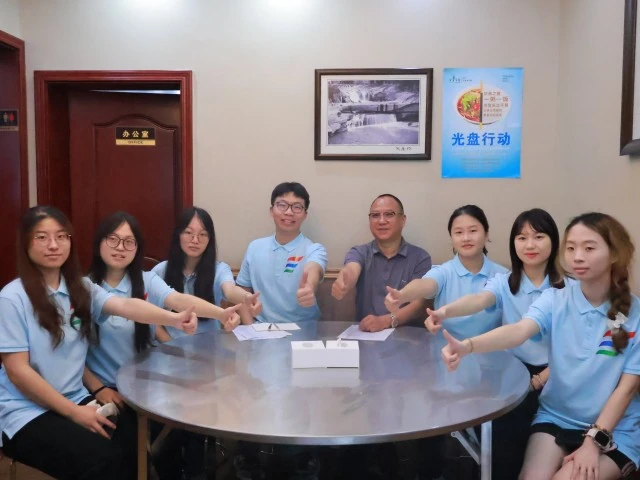 (图为服务队成员与周大林总经理探讨资助学生机缘 郭怡婷摄)