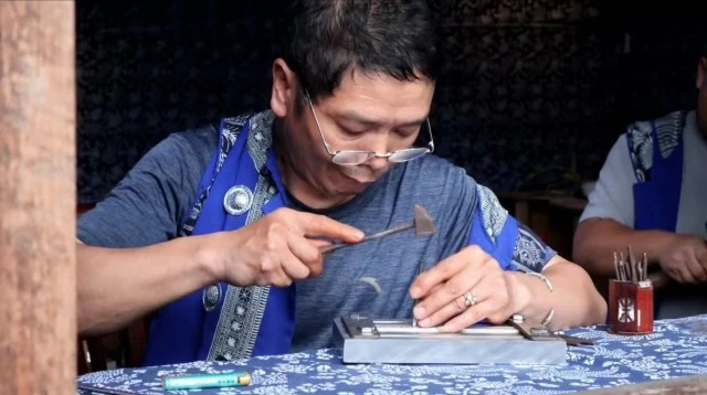 (图为苗银工艺传承人现场表演苗族银饰锤打锻造技艺)