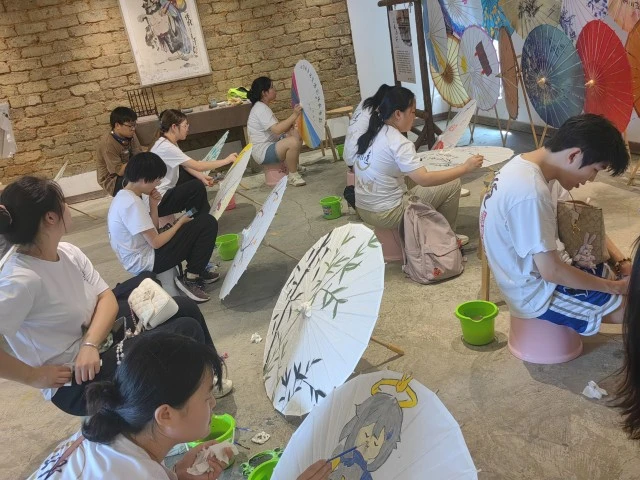 在体验了花草纸的制作后,团队成员们又转战到了油纸伞的制作现场。油纸伞作为中国传统手工艺品之一,其制作过程同样繁琐且充满挑战。民间有谚语云:“工序七十二道半,搬进搬出不肖算。”这足以说明制作油纸伞的复杂程度。