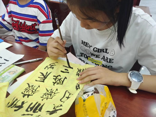 课堂上,墨香四溢,宣纸铺陈。支教团志愿者詹雨欣,她的课堂从文字的认识到文字的演变最后讲到书法,引领学员们走进书法的奇妙世界。学员们全神贯注,用心感受着每一笔每一划所蕴含的力量。