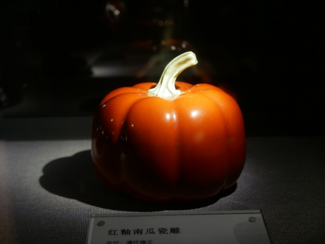 图二为博物馆红釉南瓜瓷雕展品