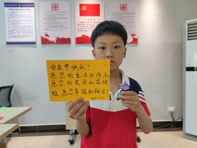 抒写母爱之歌,翻折美丽之花。在活动中,志愿者们首先告诉孩子们母亲在每个人的一生中都扮演着很重要的角色,从咿呀学语到蹒跚学步,再到成长为独立的个体,每一步都离不开母亲的悉心指导和呵护。很多时候都是母亲在背后默默地奉献 ,不求回报的付出,在未来的道路上指引孩子们前行。这一幕幕都彰显着母爱的伟大。母亲节不仅仅是一个节日,更是一个表达爱意、感恩母爱的机会,为了让孩子们更好地理解和表达出对母亲的爱,志愿者们准备了彩色的纸张和彩笔 ,孩子们在纸上写出对母亲的爱意,发挥想象进行创作。有写下“母亲节快乐!祝您永远年轻美丽!”;也有写下“妈妈,我爱您!天天开心没烦恼!”;还有在纸张上画画来表达对母亲的爱意。这些话语虽然简单,但一撇一捺中却充满了孩子们对母亲深深的爱意和感激之情。同时,志愿者们耐心地教孩子们折纸,孩子们认认真真地学习着,一步一步的操作下,一朵朵漂亮的小花呈现在眼前,每一个都是独一无二的存在,孩子们很自豪地完成自己的作品。简单的话语、手折的花朵都是孩子们用最真诚的心,来表达对母亲的感恩与爱意。