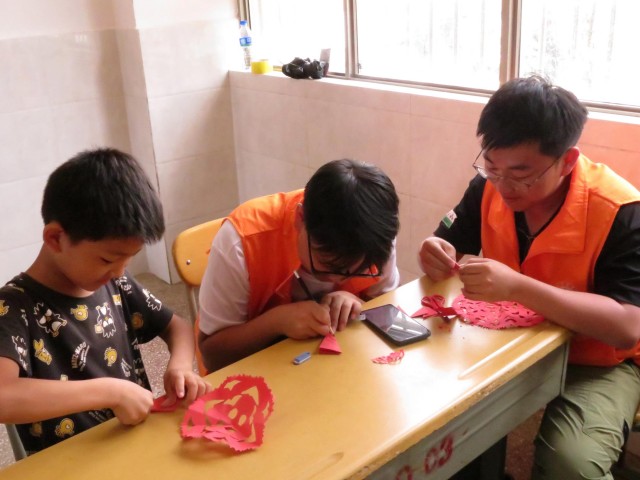 图为志愿者与同学共同完成剪纸(刘文肸 摄)