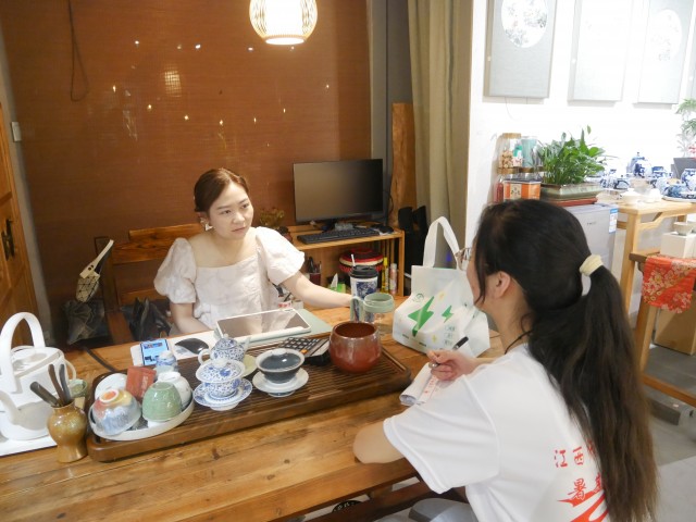 图三为陶艺人唐玲与实践团成员交流