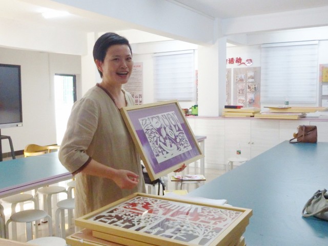 图为非遗传承人曹小琴老师向队员们展示学员的雕花剪纸作品。通讯员 容菲 供图