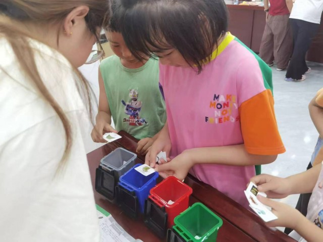 接着,一场以“保护环境”为主题的课程开始上课了。李老师通过生动的PPT和互动游戏,向孩子们普及了垃圾分类的重要性及其对环境的影响。其中,垃圾分类小游戏更是将课堂气氛推向了高潮。孩子们每人拿着垃圾卡片,通过识别不同类型的垃圾并将其正确分类到指定的垃圾桶中,不仅加深了对垃圾分类知识的理解,还培养了他们的环保意识和责任感。