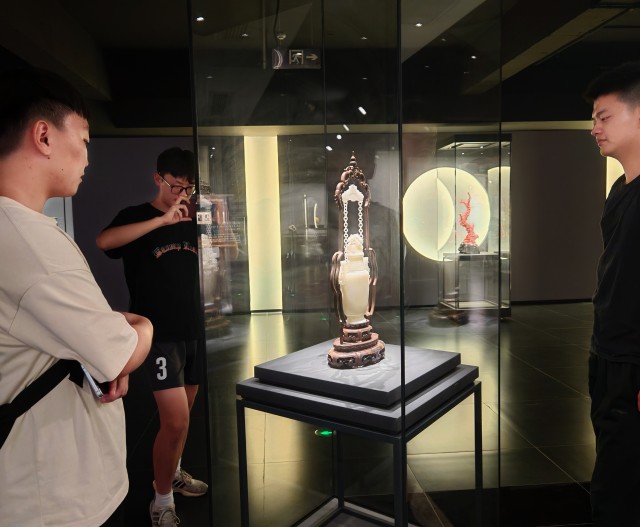 (图为团队成员在参观扬州非遗珍宝馆艺术品 大学生网报通讯员 姚沈阳 摄)