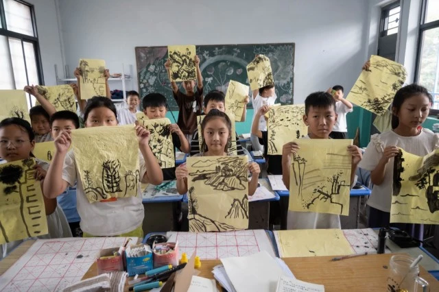 图为观音堂小学学生们展示美术课画的山水画作品。