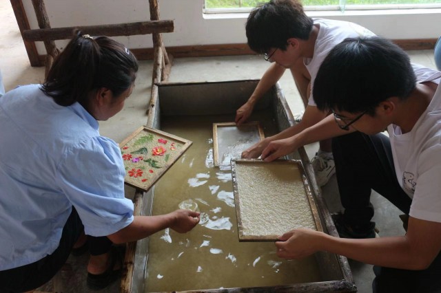 在制作花草纸的工坊里,阳光透过窗棂,洒在排列整齐的工具和材料上,仿佛为这一场创作铺上了一层金色的光辉。非遗传承人手把手地指导着队员们,他们的眼神中透着专注与慈爱,仿佛在传递着一份无比珍贵的使命。