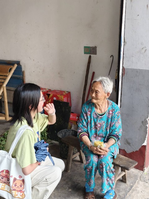 小暑前后的天气总是变化无常,终于逮着一个大晴天,实践队队员们收拾好背包,满怀激情地踏上走访村民的路途。走在乡里被太阳晒得滚烫的水泥路上,眼看着一户户人家排在路两旁,但第五小组一行三人谁都不敢走出第一步,高楼大厦里人与人之间的疏远感让他们不自觉害怕与不认识的人搭话……正当他们畏缩不前时,一道饱含热情的声音打破了他们的扭捏,“你们是来做什么的呀?”队员们愣了一下,转身就看见一位慈眉善目的老婆婆笑眯了眼,“奶奶,我们是来自西南石油大学的大一学生,这次三下乡志愿服务来溪头乡走访……”实践队队员们向奶奶谈起这次三下乡实践活动的来意,奶奶一边听着一边为队员们搬来板凳、拿橘子来招待队员们……门外蝉鸣此起彼伏,屋里谈笑和乐融融。
