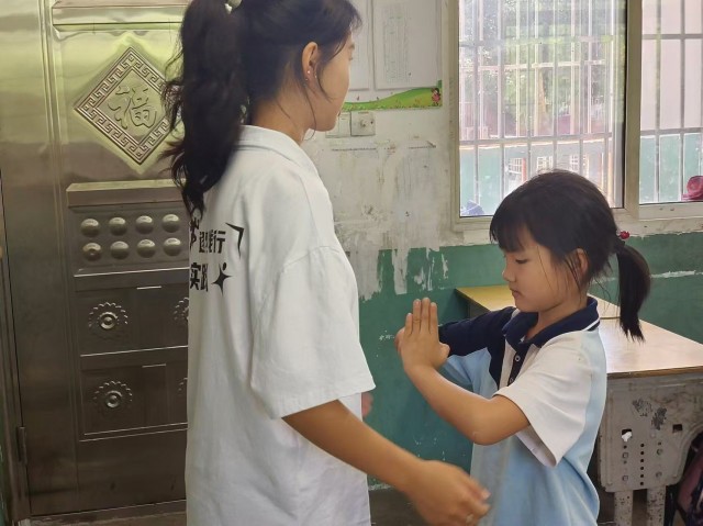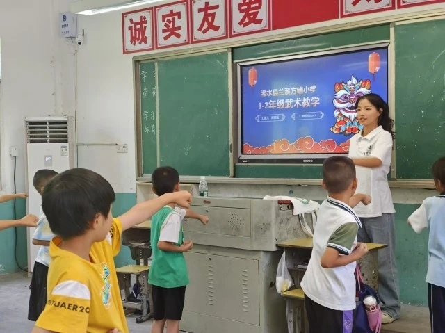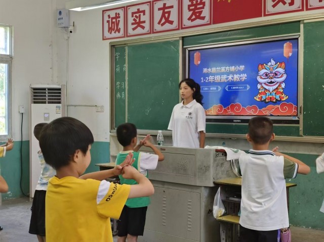 为了让学生保持身心健康,增加课堂趣味性。7月24日,湖北师范大学体育学院“青力志愿服务”支教团队,继续在黄冈市浠水县第七实验小学方铺校区教室内开展了武术课程。