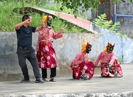 图为三溪乡石邮村非遗传承人吴老先生教小朋友们学习傩舞舞蹈动作,并进行简单的讲解,让孩子们进一步感受到傩舞非遗文化的魅力。大学生网报通讯员