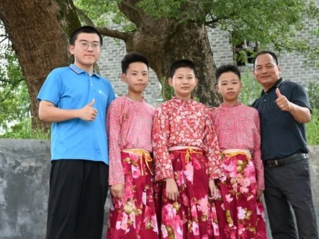图为三溪乡石邮村非遗传承人吴先生向三下乡团队成员展示傩舞表演后的合照。大学生网报通讯员 洪欣怡 供图