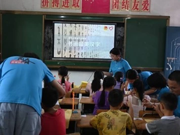 图为志愿服务团队成员进行书法授课,并进行现场教学指导。大学生网报通讯员 洪欣怡