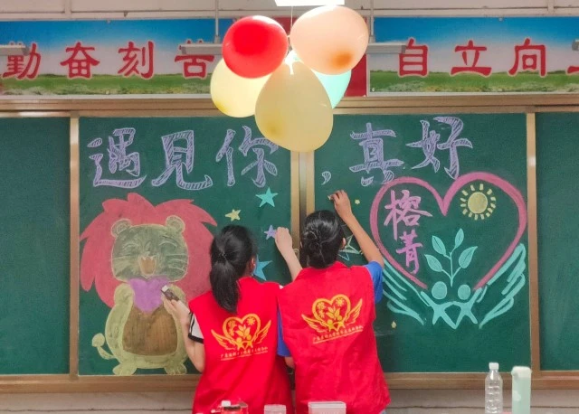 志愿者们紧扣“开营仪式”的主题,充分发挥创意。他们通过彩带、气球、黑板报等元素,营造了一个充满活力和正能量的空间。乡村教室在志愿者们的巧手下焕发出新的生机:彩带飘扬、气球摇曳,每一处细节都被赋予了梦幻般的靓丽色彩:薄雾朦胧、光影斑驳,每一寸装点都透露着志愿者们对乡村教育的热忱与期待。与此同时,志愿者们还充分考虑了乡村学校的实际情况与孩子们的切实需求,精心调整了桌椅的摆放位置,确保每个孩子都有一个舒适的听课环境与活动空间。志愿者们深知,这次活动不仅仅是简单的交流与服务,更是为乡村学校带来新鲜血液、激发孩子们学习兴趣的重要契机,而前期的准备与布置工作,就是为即将开展的第一次活动奠定最坚实的基础。