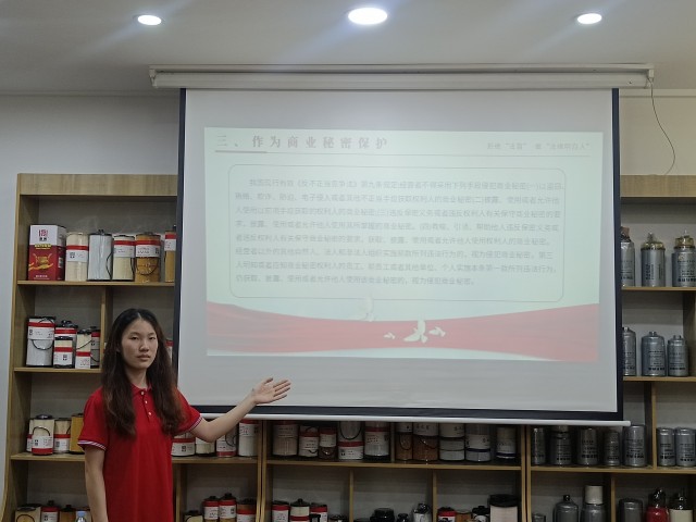 团队成员主要围绕什么是知识产权、注册商标专用权保护、专利的保护等方面展开讲解,宣讲过程中贯穿《中华人民共和国商标法》、《中华人民共和国专利法》、《中华人民共和国反不正当竞争法》等相关法律法规。首先,团队成员通过实际案例分析,深入浅出地讲解了如何申请和维护知识产权。其次,对于与知识产权联系密切的商业秘密的构成要件、认定标准以及保护措施进行了阐述,提醒企业要建立完善的商业秘密保护制度,加强员工保密教育、签订保密协议等。同时,还介绍了在遭遇商业秘密泄露时的应对处置方法和法律救济途径。最后,宣讲员对于企业宣传、经营过程中可能涉及的知识产权侵权风险点做出提示,针对性地提出了防范化解的法律参考及对策建议。团队成员通过发布的知识产权侵权典型案例以案说法,告知企业要依法经营,学会用法律武器保护自己,提升企业员工知识产权创造、运用和保护能力。