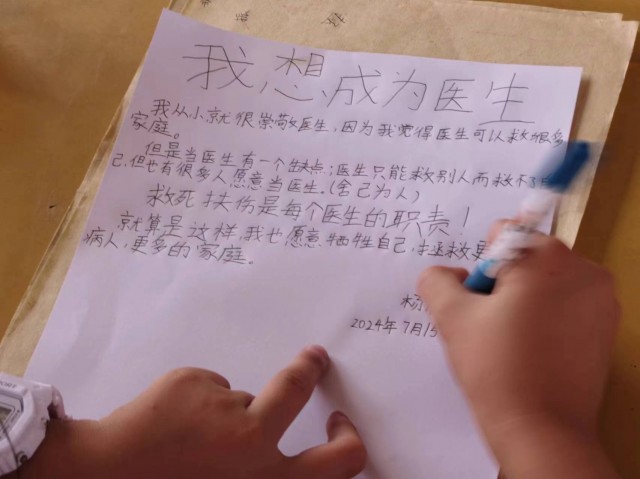 其中,一个叫杨晨浠的小女孩吸引住了我的目光。“我想成为医生。我从小就崇敬医生,因为我觉得医生可以拯救很多家庭。但是当医生有一个缺点:医生只能救别人而救不了自己,但也有很多人愿意当医生,舍己为人。救死扶伤是每个医生的职责!就算这样我也愿意牺牲自己,拯救更多的家庭。”我看她书写下自己的梦想,一笔一划,是那样的坚定认真。后来,我与她慢慢熟络起来。我了解到她家可以算是书香世家。在她爷爷的感染带动下,家里三代人都会书画创作。她也是从小就接受书画教育,写得一手好字。她深信,书法所培养的耐心与韧性,不仅将帮助她成为一名优秀的医生,而且当她为病人开处方单的时候,清晰的字迹将确保病人理解医嘱。短短的几句话,却充满了无限的力量与温暖。那一刻,她的纯真与坚韧深深地触动了我。