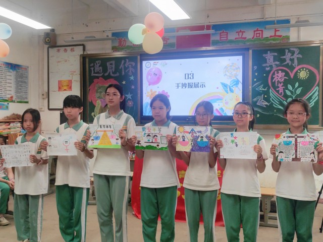 图为优秀小画家们展示自己的手抄报。通讯员蔡彦希 摄