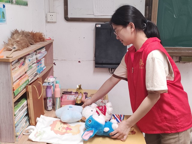 图为服务队队员认真摆放为学生们准备的奖品。通讯员吴舒昕 摄