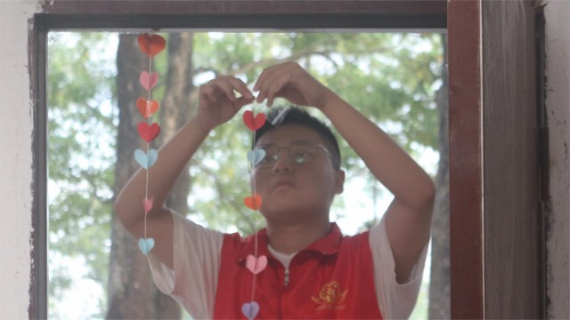 图为服务队队员为开营仪式装饰教室。通讯员蔡彦希 摄